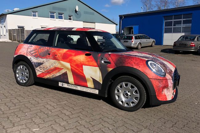 MINI Union-Jack Es sind keine Limits gesetzt! Ansprechende Fahrzeugbeschriftungen sind die Visitenkarte Ihres Unternehmens. Eine professionelle Beratung und die eigene werbetechnische Umsetzung machen uns zu einem schnellen und zuverlässigen Partner für Ihr Projekt. Die Beschriftung erfolgt ausschließlich mit hochwertigen Folien, die sich durch ihre Witterungsbeständigkeit, Formstabilität und Lichtechtheit auszeichnen.